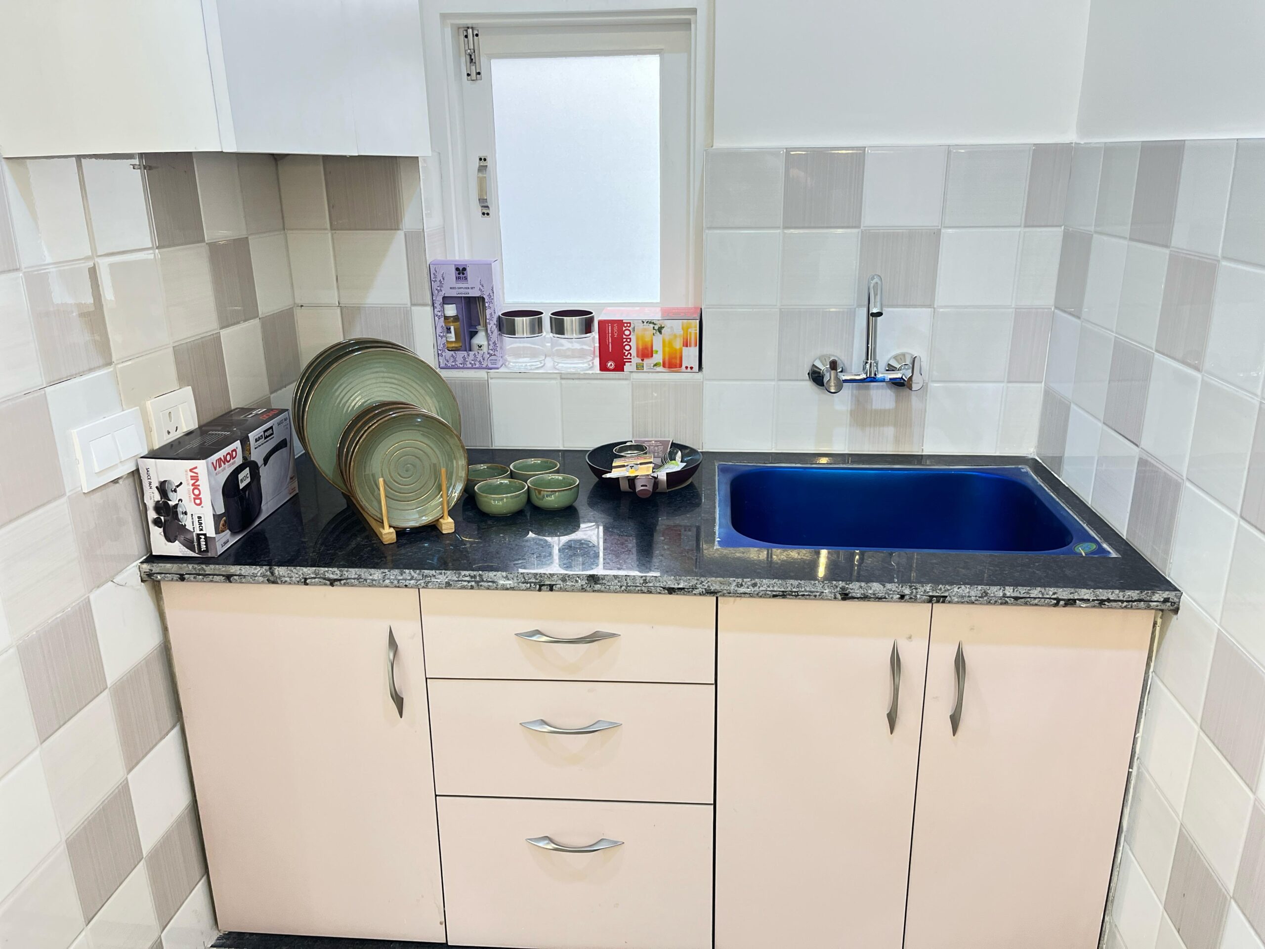 - Stainless steel sink with hot and cold water mixer. Kitchen counter top in highly polished Green Marble. No woodwork.
